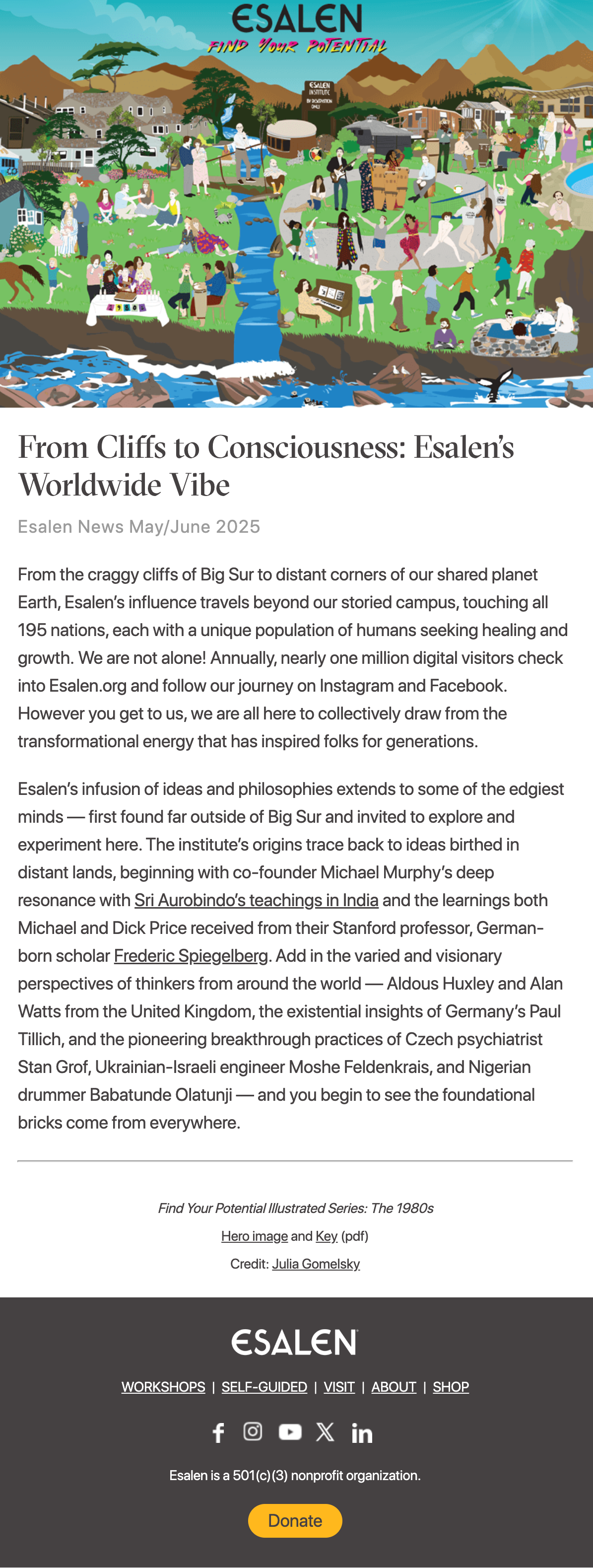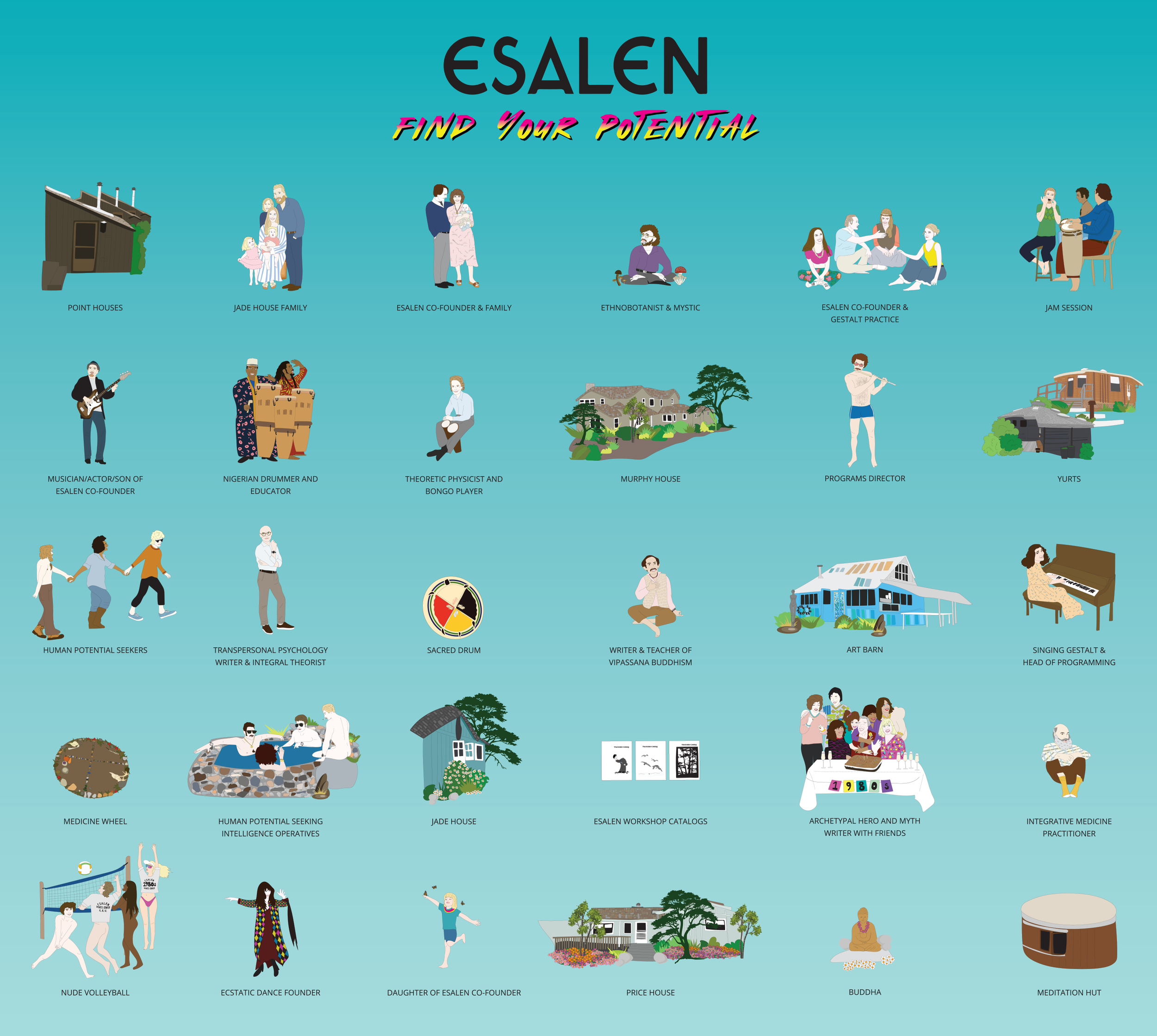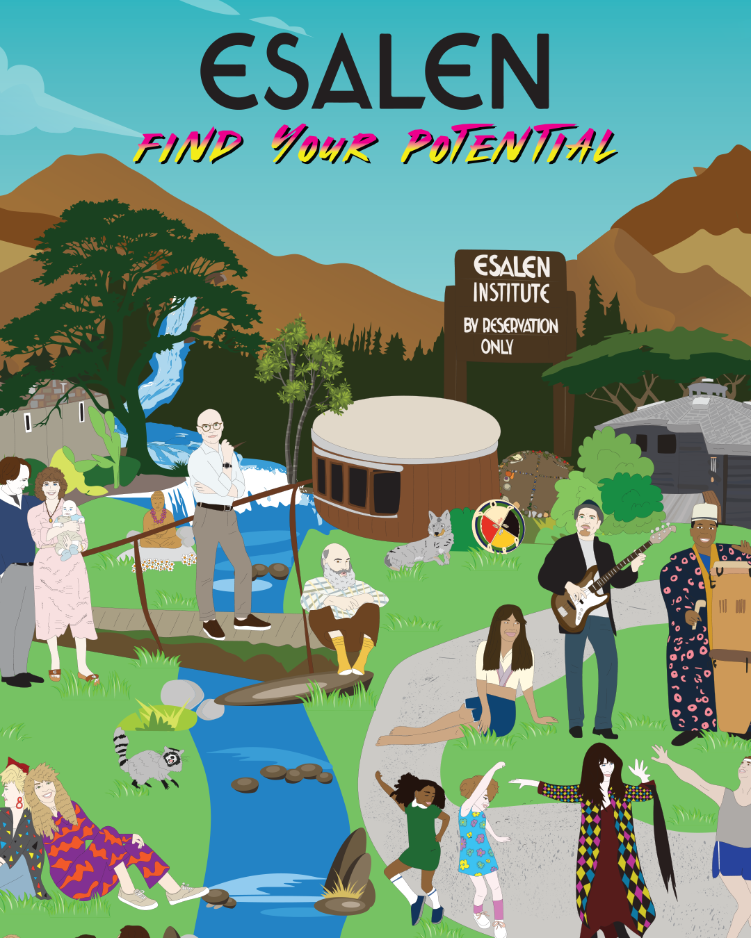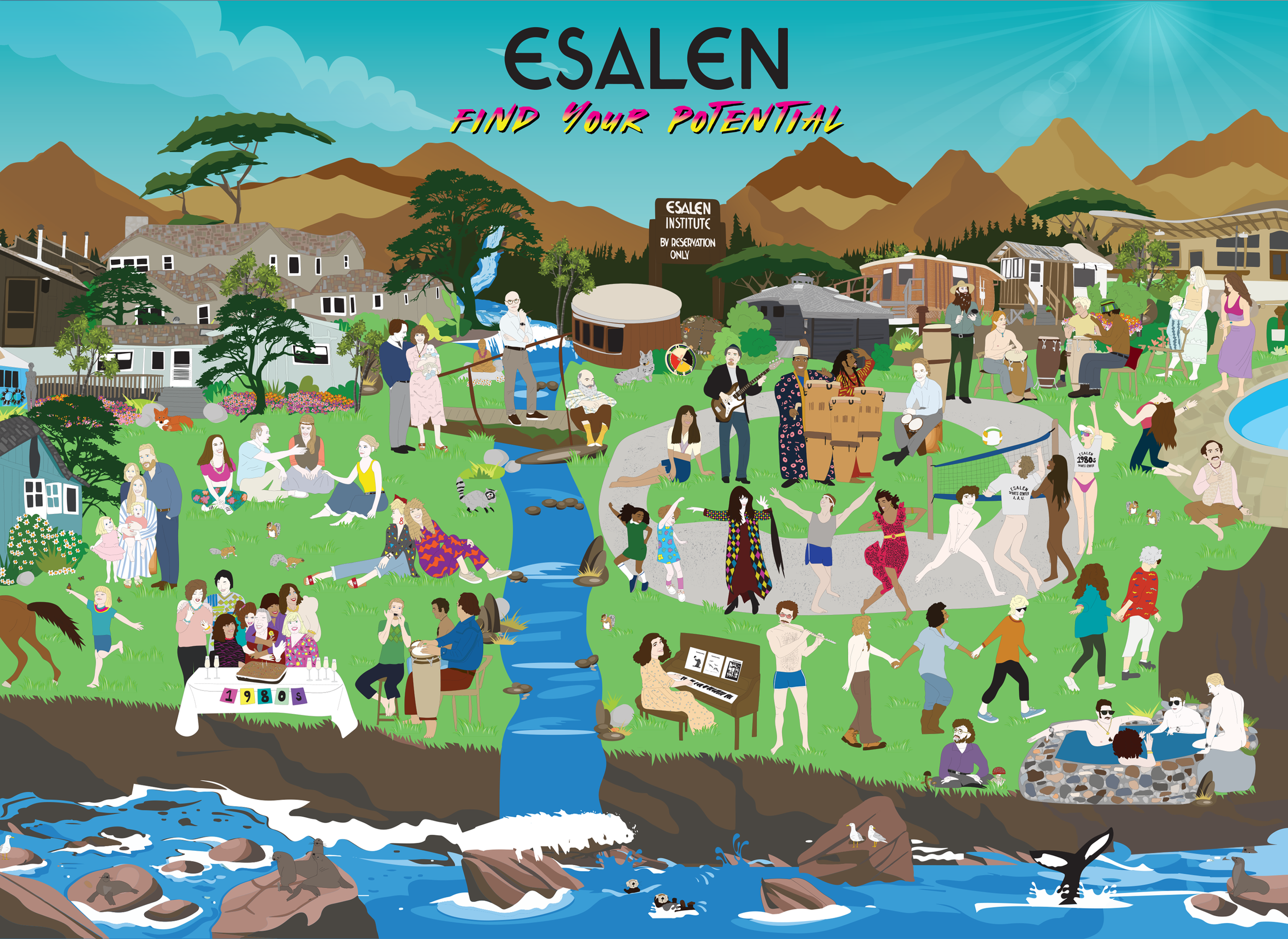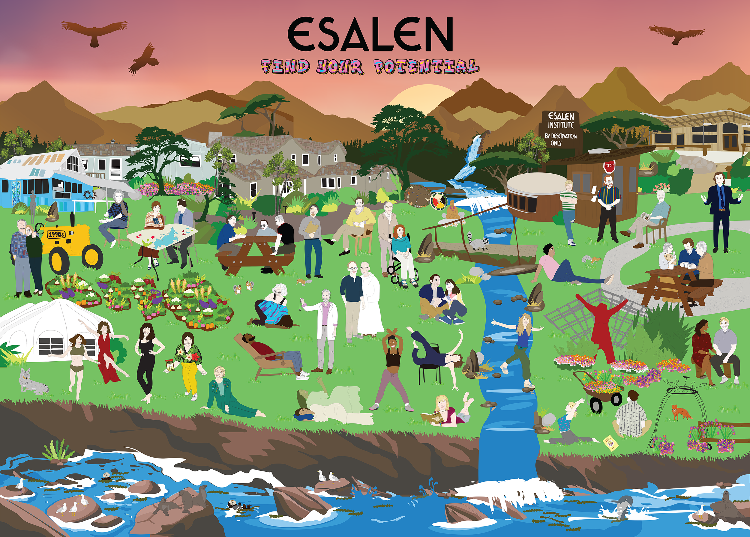 Illustrate the Esalen campus, animals (air, land and sea) along with all the movers and shakers from the 1960s through present day.